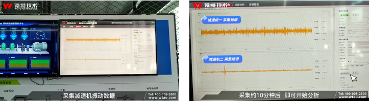 通過WT-MSAM綜合數據采集控制模塊實時采集多個通道的振動數據,通過頻譜畫面可以看出兩臺減速機的振動頻率存在明顯差異。數據采集約10分鐘即可開始分析。