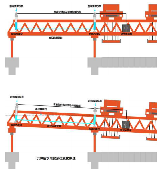 此次我們主要針對架橋機過孔和架梁過程中的前高后低姿態,以及整機橫移過程中前、中支腿軌道平行度狀態采取實時監控,讓架橋機在施工過程中保持良好的運行姿態,減少失穩帶來的安全風險,使架橋機運行更安全,管理更高效。