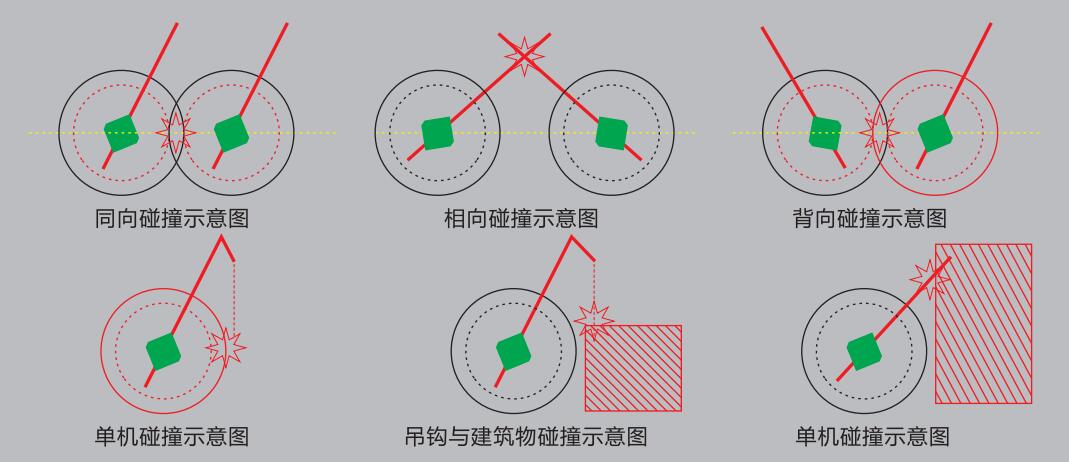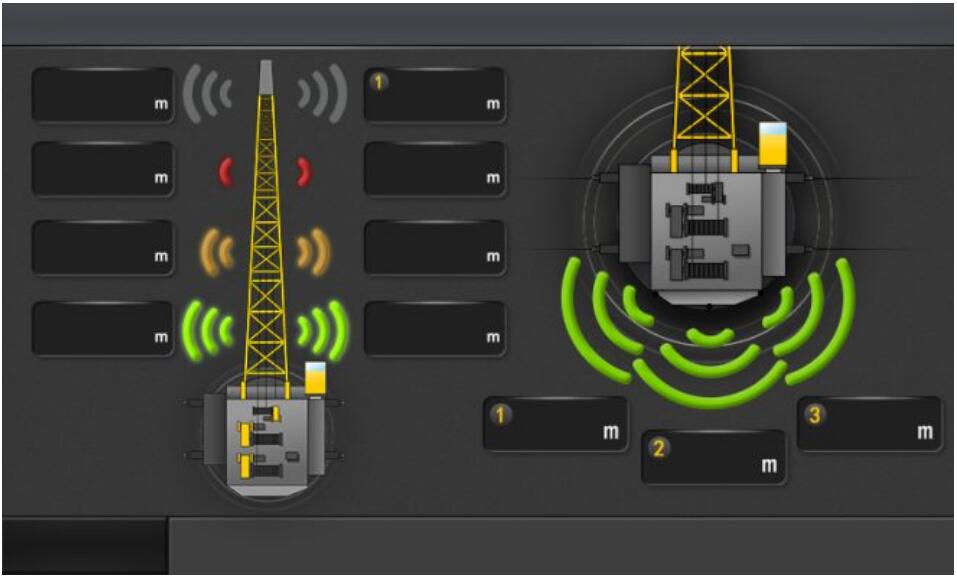 區域主動防碰撞系統: 通過雷達主動監測起重機易碰運動部位路徑,探測區域空間內是否有障礙物,以此來避免吊機與吊機間,回轉部位與其它物體、臂架與周邊物體之間的區域空間是否安全,在安全區被入侵時發出聲、光報警,甚至給出止停控制信號,實現主動防碰撞監測保障設備安全。