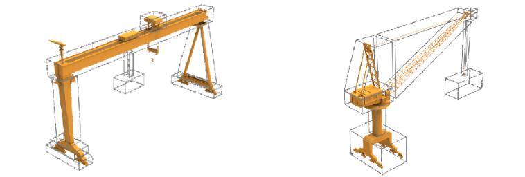 將關聯的吊機設備按實體結構實際尺寸,分解成N個6面體數據模型,數據模型的基礎尺寸按吊機的實際幾何尺寸1:1比例設立,其真實地反映了吊機設備實體的裝配位置關系、外形尺寸。
