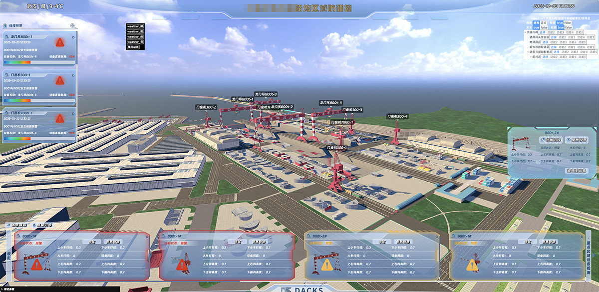 需要做集中集控管理的用戶,系統還需配置遠程三維監(jiān)控平臺。將船塢組裝場地進行三維場景模型處理,且需保證關鍵位置(如軌道位置關系等設備運行活動范圍)與設備產生空間關系的區(qū)域,按照1:1精確建模,并展示上做突出處理,保證能準確、清晰地反映設備當前工況。