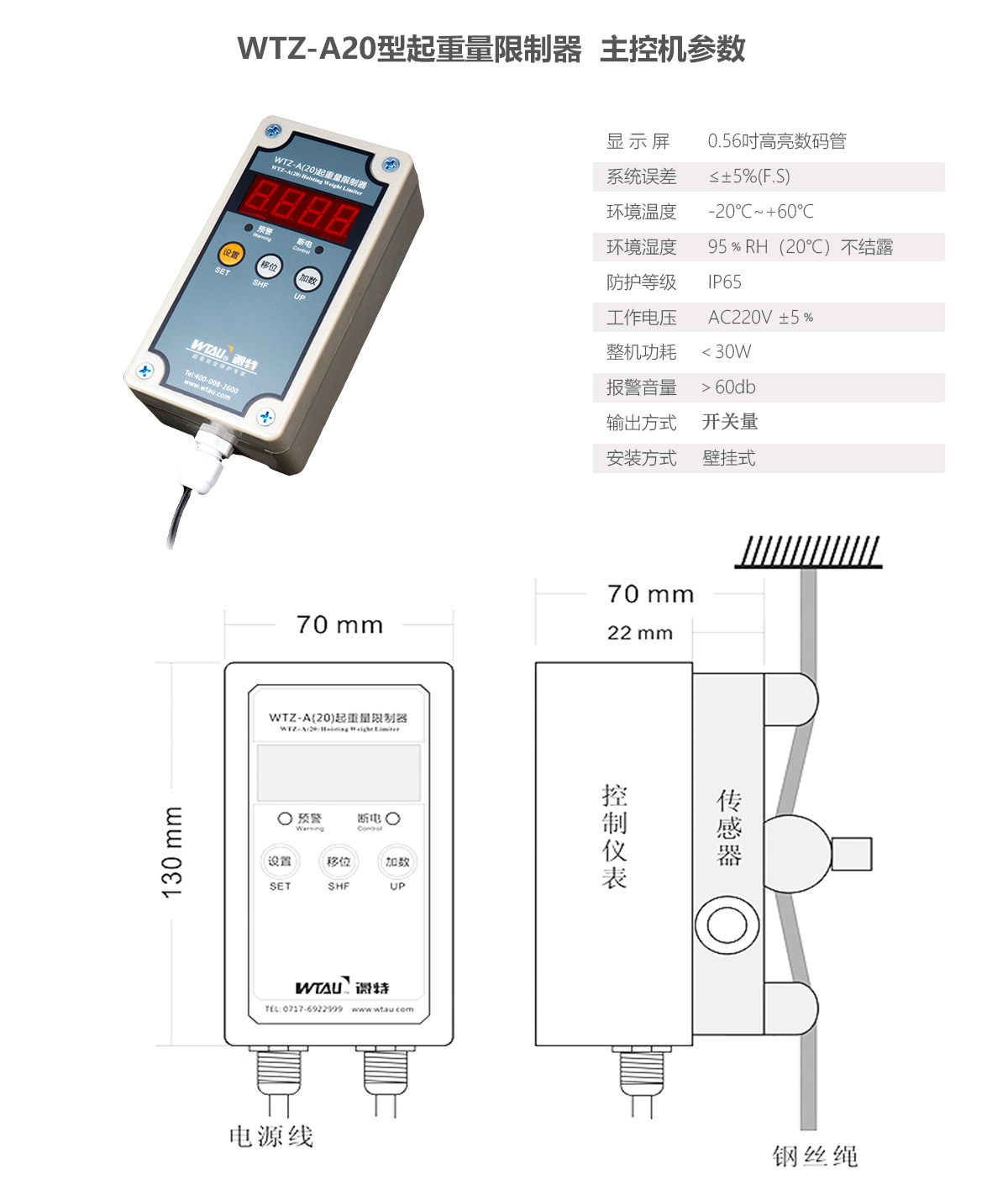 WTZ-A20起重量限制器用于一路重量信號監(jiān)測,適用于升降機(jī)、電動(dòng)葫蘆等鋼絲繩置吊的起重設(shè)備。